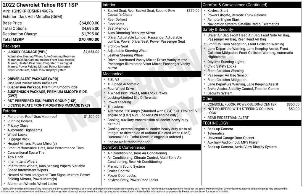 Why BUY from Gregg Young Chevy Omaha? When you choose this Dark Ash Metallic 2022 Chevrolet Tahoe RST with 116,485 miles, you are not just buying a used vehicle - you are investing in quality, reliability and peace of mind. Our clientele depend on us for Transparent Pricing, Convenience and, most importantly, Customer FIRST Service! All purchases include 5 year Complimentary Maintenance Package, valued at over $1,000! What this vehicle includes: Driver Alert PackageRear Cross Traffic AlertLane Change Alert with Side Blind Zone AlertLuxury Package ($2,525 value)Memory Settings3rd Row 60/40 Power-Folding Split-Bench Seat2nd Row Power Release 60/40 Split-Folding Bench SeatOutside Heated Power-Adjustable MirrorsHeated 2nd Row Outboard SeatsHeated Steering WheelPower Tilt and Telescopic Steering ColumnRear Pedestrian AlertHD Surround VisionPreferred Equipment Group 1SPFront High-Back Reclining Bucket SeatsMemory Settings For DriverDriver and Front Outboard Passenger AirbagsColor-Keyed Carpeting Floor Covering1st and 2nd Row Color-Keyed Carpeted Floor MatsRemote StartBright Front and Rear Door Sill PlatesFloor Console with Storage AreaAuto-Dimming Inside Rearview MirrorStop/start System Disable ButtonChevrolet Infotainment 3 Premium System RadioWireless ChargingAutomatic Stop/startLeather-Wrapped Steering Wheel22" X 9" Bright Machined WheelsPerforated Leather Seat TrimLED Daytime Running LampsHands-Free Rear Power Programmable LiftgateSiriusXM Radio with 360LEnhanced Driver Information CenterUniversal Home RemoteInfotainment DisplayBose 9-Speaker Stereo Audio System Feature275/50R22SL AS BW Tires Safety and Security Forward collision mitigation - Forward thinking. You look away for just a second and suddenly the vehicle in front of you has stopped. That's when the forward collision mitigation system comes to life. When it senses an impending impact, it will activate a combination of features to help prevent or reduce the severity of an accident. Forward collision mitigation is always looking ahead. Forward collision mitigation - Forward thinking. You look away for just a second and suddenly the vehicle in front of you has stopped. That's when the forward collision mitigation system comes to life. When it senses an impending impact, it will activate a combination of features to help prevent or reduce the severity of an accident. Forward collision mitigation is always looking ahead. Pedestrian impact prevention - An extra step toward safety. Pedestrians don't always stop, look, and listen, but with Pedestrian Impact Prevention, your vehicle is equipped to better see them and avoid them. This system constantly monitors the road ahead to identify and track pedestrians. It projects that image to an interior display screen, AND should an impact become likely, Pedestrian impact prevention takes steps to avoid a collision.Technology and Telematics Apple CarPlay/Android Auto smart device wireless mirroring Mobile hotspot - WiFi on the fly. Connect your devices to the Internet through your vehicles private mobile hotspot and take the internet wherever your journey takes you, without eating up your data allowance. Find the hotspot with mobile hotspot. SUSPENSION PACKAGE, PREMIUM SMOOTH RIDE, EMISSIONS, FEDERAL REQUIREMENTS, ENGINE, 5.3L ECOTEC3 V8, TRANSMISSION, 10-SPEED AUTOMATIC, GVWR, 7500 LBS. (3402 KG), REAR AXLE, 3.23 RATIO, WHEELS, 22" X 9" (55.9 CM X 22.9 CM) BRIGHT MACHINED HIGH-GLOSS BLACK PAINTED, DARK ASH METALLIC, SEATS, FRONT BUCKET, JET BLACK/VICTORY RED, PERFORATED LEATHER SEATING SURFACES 1ST AND 2ND ROW, AUDIO SYSTEM, CHEVROLET INFOTAINMENT 3 PREMIUM SYSTEM WITH GOOGLE BUILT-IN, LUXURY PACKAGE, DRIVER ALERT PACKAGE, SUNROOF, POWER PANORAMIC, DUAL-PANE, TILT-SLIDING, MIRRORS, OUTSIDE HEATED POWER-ADJUSTABLE, POWER-FOLDING, DRIVER-SIDE AUTO-DIMMING, LICENSE PLATE FRONT MOUNTING PACKAGE, SEATS, HEATED SECOND ROW OUTBOARD SEATS, SEATS, SECOND ROW BUCKET, POWER RELEASE, SEATS, THIRD ROW 60/40 SPLIT-BENCH, POWER FOLDING, CONSOLE, F
