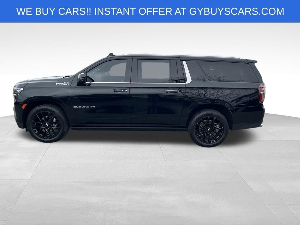 Our unrelenting One Owner 2023 Chevrolet Suburban High Country 4WD with the Premium 2 Pack helps you take the high ground in Black! Motivated by a 6.2 Liter V8 generating 420hp matched to a 10 Speed Automatic transmission for first-class family travel. This Four Wheel Drive SUV ratchets up the capability with Magnetic Ride Control, a two-speed transfer case, and a limited-slip rear differential, and it sees nearly 18mpg on the highway. Lengthy and luxurious, our Suburban showcases LED lighting, stunning 22-inch wheels, bright roof rails, a hands-free liftgate, dual exhaust outlets, and our Premium 2 Pack for a panoramic sunroof and power running boards with perimeter lighting.