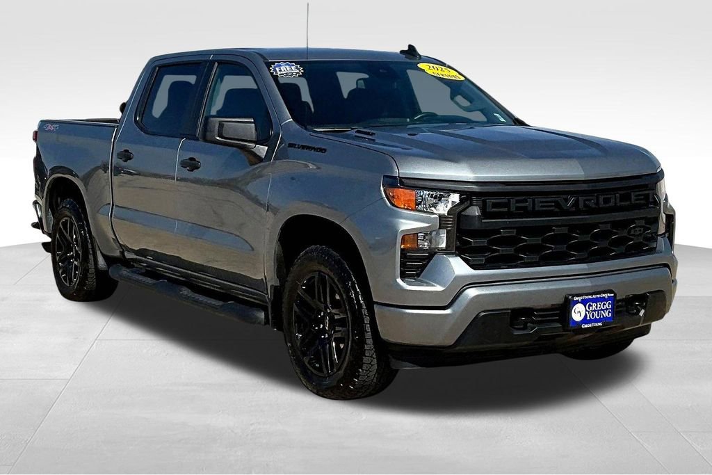 Our One Owner, Accident Free 2025 Chevrolet Silverado 1500 Custom Crew Cab 4X4 with the Blackout Pack in Sterling Gray Metallic is here to help with your next adventure! Motivated by a 2.7L TurboMax providing 310hp to an 8 Speed Automatic transmission to keep you on top of your game. This Four Wheel Drive truck also has a high-capacity suspension for heavier loads, and it returns nearly 21mpg on the highway. Upsized 20-inch alloy wheels help our Silverado 1500 stand proud as it welcomes you with LED lighting, a power lock/release EZ Lift tailgate, LED bed lighting, a 2-inch receiver hitch, black nameplates, black assist steps, a 120V outlet, and 20-inch high gloss black wheels.