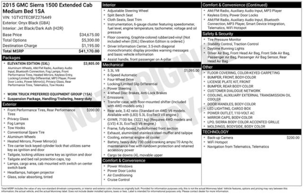 A cut above the rest, our **Accident Free**2015**GMC**Sierra 1500**4X4**Double Cab**Elevation Edition** is presented in beautiful Onyx Black. Powered by a 5.3 Liter EcoTec3 V8 delivering 355hp paired to a 6 Speed Automatic transmission for tough commands. Our Four Wheel Drive secures up to 22mpg highway. At the same time, the electronically controlled with overdrive and Tow/Haul mode provide great hauling and towing capability paired with coil-over-shock front suspension, offering a controlled ride that is the ultimate in comfort and handling.