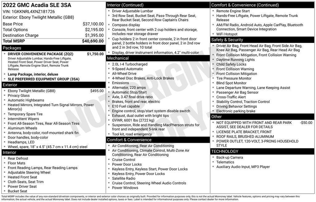 Why BUY from Gregg Young Chevy Omaha? When you choose this Summit White 2022 GMC Acadia SLE with 81,886 miles, you are not just buying a used vehicle - you are investing in quality, reliability and peace of mind. Our clientele depend on us for Transparent Pricing, Convenience and, most importantly, Customer FIRST Service! All purchases include 5 year Complimentary Maintenance Package, valued at over $1,000! What this vehicle includes: Driver Convenience Package ($1,750 value)8-Way Power Driver Seat AdjusterPower Driver Lumbar Control Seat AdjusterRemote StartHeated Driver and Front Passenger Seats120-Volt Power OutletHands Free Power Programmable LiftgateBrushed Aluminum Roof RailsPreferred Equipment Group 3SA Safety and Security Forward collision mitigation - Forward thinking. You look away for just a second and suddenly the vehicle in front of you has stopped. That's when the forward collision mitigation system comes to life. When it senses an impending impact, it will activate a combination of features to help prevent or reduce the severity of an accident. Forward collision mitigation is always looking ahead. Pedestrian impact prevention - An extra step toward safety. Pedestrians don't always stop, look, and listen, but with Pedestrian Impact Prevention, your vehicle is equipped to better see them and avoid them. This system constantly monitors the road ahead to identify and track pedestrians. It projects that image to an interior display screen, AND should an impact become likely, Pedestrian impact prevention takes steps to avoid a collision.Technology and Telematics Apple CarPlay/Android Auto smart device wireless mirroring Wireless Apple CarPlay/Wireless Android Auto smart device wireless mirroring Mobile hotspot - WiFi on the fly. Connect your devices to the Internet through your vehicles private mobile hotspot and take the internet wherever your journey takes you, without eating up your data allowance. Find the hotspot with mobile hotspot. EMISSIONS, FEDERAL REQUIREMENTS, ENGINE, 2.0L TURBO, 4-CYLINDER, SIDI, TRANSMISSION, 9-SPEED AUTOMATIC, ELECTRONICALLY-CONTROLLED, AXLE, 3.47 FINAL DRIVE RATIO, WHEELS, 18" (45.7 CM) MACHINED ALUMINUM WITH DARK ACCENTS, TIRES, P235/65R18 ALL-SEASON BLACKWALL, SUMMIT WHITE, SEATS, FRONT BUCKET, JET BLACK, PREMIUM CLOTH SEAT TRIM, SEATING, 6-PASSENGER (2-2-2 SEATING CONFIGURATION), AUDIO SYSTEM, 8" DIAGONAL GMC INFOTAINMENT SYSTEM, DRIVER CONVENIENCE PACKAGE, ROOF RAILS, BRUSHED ALUMINUM, LICENSE PLATE BRACKET, FRONT, LIFTGATE, POWER PROGRAMMABLE, HANDS FREE, SEAT ADJUSTER, DRIVER 8-WAY POWER, SEAT ADJUSTER, POWER DRIVER LUMBAR CONTROL, SEATS, HEATED DRIVER AND FRONT PASSENGER, POWER OUTLET, 120-VOLT, 3-PRONG HOUSEHOLD STYLE, REMOTE START, NOT EQUIPPED WITH FRONT AND REAR PARK ASSIST, SEE DEALER FOR DETAILS When you choose a Certified Pre-Owned vehicle from Gregg Young, youre not just buying a used car youre getting extra protection, added peace of mind, and built-in value you wont find with an ordinary pre-owned vehicle. Every Certified Pre-Owned vehicle must pass an extensive 172-point inspection performed by trained technicians. From engine and transmission performance to interior quality, safety features, and road-test standards, we verify the vehicle meets strict certification requirements before it ever reaches our lot. Ask if this vehicle qualifies for our Certified Pre-Owned Program 12-Month / 12,000-Mile Premier Coverage Drive confidently from day one. Our Premier Warranty* protects you against unexpected repairs for your first 12 months or 12,000 miles. Whats covered? Practically all major vehicle components (excluding maintenance items and wear-and-tear parts) Electrical, mechanical, interior, exterior, and more giving you true peace of mind with your purchase. 36-Month / 100,000-Mile Powertrain Protection Our Certified Powertrain Warranty** keeps you covered long after you leave the dealership, protecting many of your vehicles most important and expensive components for up