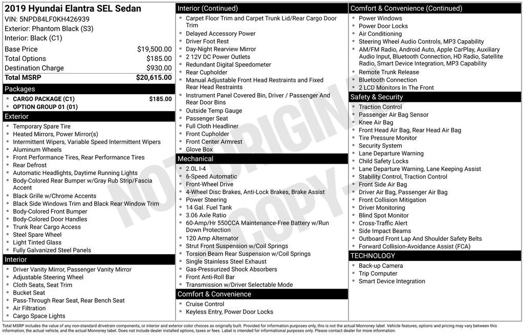 Our **2019**Hyundai**Elantra**SEL**Sedan**Apple CarPlay & Android Auto**Rear Camera** will enrich and enhance your driving experience shown in stunning Black! Powered by a 2.0 Liter 4 Cylinder generating 147hp tethered to a 6 Speed Shiftronic Automatic transmission with Active ECO. Our Front Wheel Drive sedan shows off nearly 37mpg on the road, while technology, performance, and style make this Elantra the whole package. As you observe the exterior, this elegant sedan's well-placed curves and muscular stance are mesmerizing.