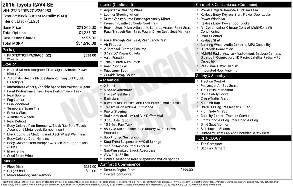 Stylish, intelligent, and adventurous, our One Owner, Accident Free 2016 Toyota RAV4 SE in Black Currant Metallic is an intelligent choice! Powered by a 2.5 Liter 4 Cylinder that offers 172hp teamed with a paddle-shifted 6 Speed Automatic transmission. With this Front Wheel Drive SUV, enjoy this smooth ride and score nearly 29mpg on the highway. Imagine yourself comfortably cruising down the road in style in our RAV4 SE! Our family-friendly machine has an attractive sculpted exterior accented by LED daytime running lights, LED tail lamps, 18-inch sport alloy wheels, and a distinct grille.