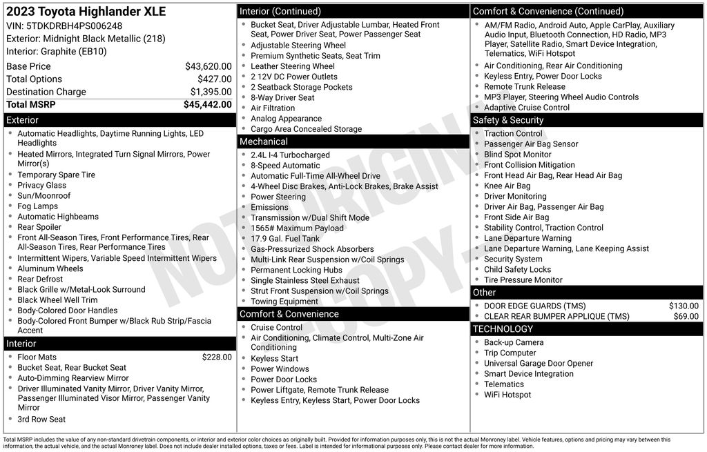 Our Accident Free, One Owner 2023 Toyota Highlander XLE AWD arrives in style with bold strength and a premium Midnight Black Metallic finish! Powered by a TurboCharged 2.4 Liter 4 Cylinder generating 265hp to an 8 Speed Automatic transmission that puts rugged capability at your command. This All Wheel Drive SUV also has a multimode performance system for mastering different conditions, and it scores nearly 27mpg on the highway. Our Highlander sets a high bar for good looks, showing off a power sunroof, LED lighting, fog lamps, roof rails, a height-adjustable power liftgate, prominent rocker panels, and 18-inch alloy wheels.