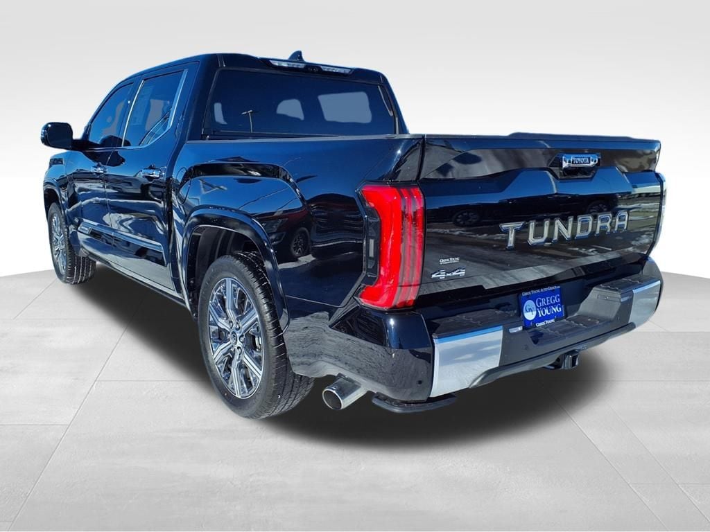 Our captivating 2023 Toyota Tundra Capstone CrewMax 4X4 raises the bar for deluxe trucks in Midnight Black Metallic! Powered by a Twin-TurboCharged 3.4 Liter i-FORCE MAX V6 and an Electric Motor delivering a combined 437hp to a 10 Speed Automatic transmission for refined yet rugged performance. This Four Wheel Drive truck also has responsive handling to inspire confidence, and it returns nearly 22mpg on the highway. Our Capstone's dominating design includes a panoramic sunroof, premium LED lighting, huge 22-inch alloy wheels, a stamped tailgate, and power running boards.